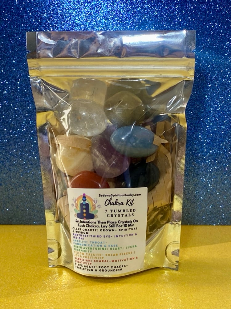 đź’ŽChakra crytals 7 with The label on top telling you each crystal inside of the package and what each crystal is used for and what chakra it pertains to