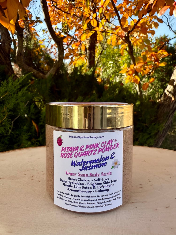 π©·6 oz β’ Pitaya & Pink Clay + Rose Quartz Crystal Powder β’ Watermelon & Jasmine Scent β’ Made with vegan sugar, Shea, butter, avocado oil, Castile soap, mica.