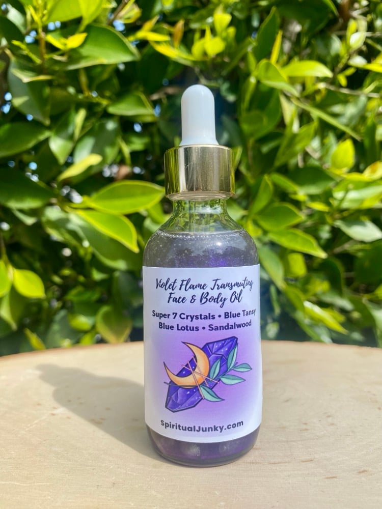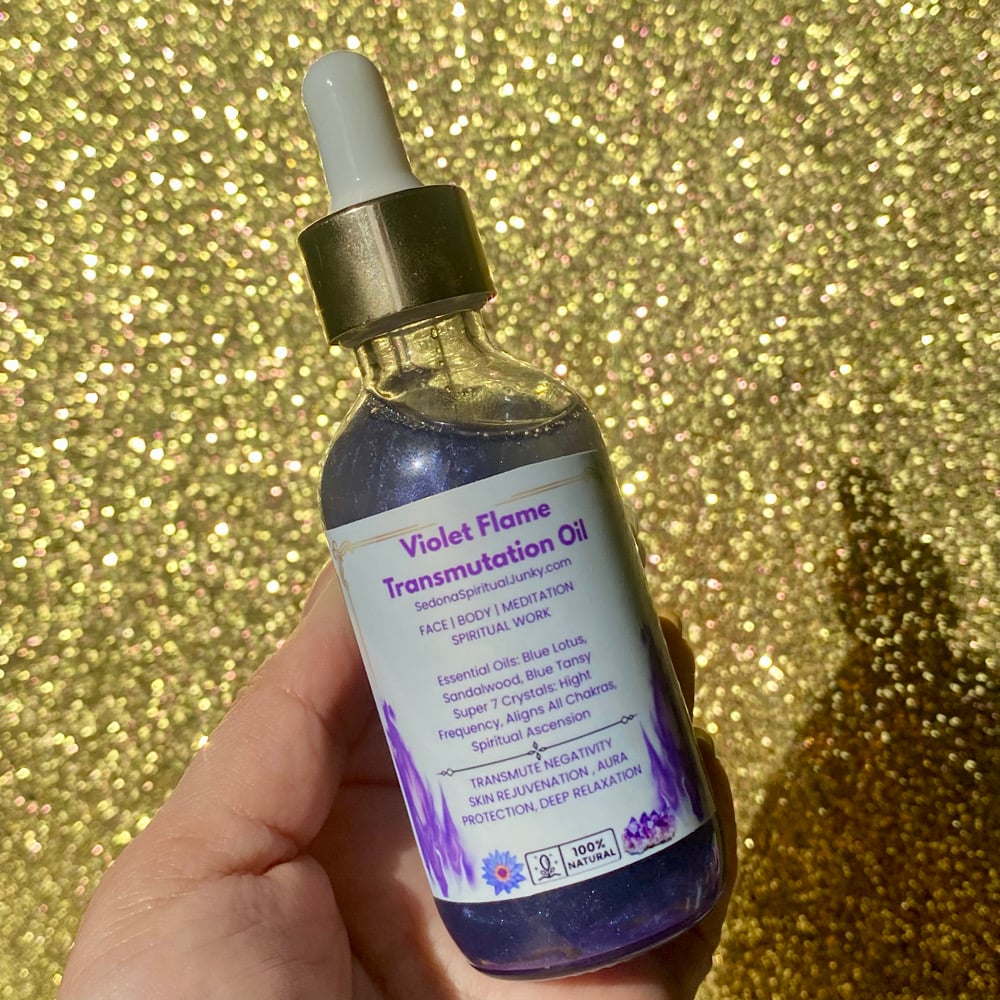 💜2oz glass dropped bottle. This oil is not just wonderful for skin healing but also for transmuting Karmic Energy because of the blend of colors in violet which are blue, pink violet known to be be the highest frequency color in the spectrum.